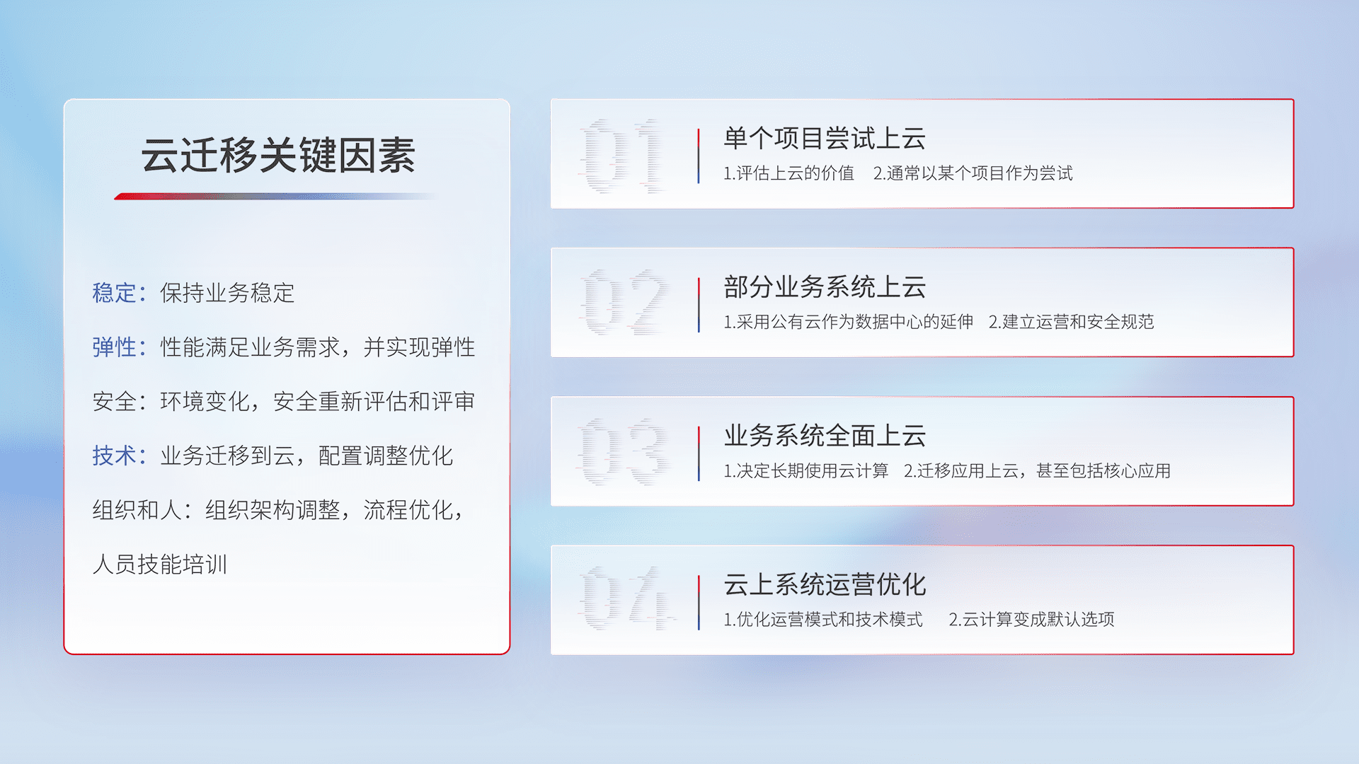 结合实际业务,,,从规划设计、、、云平台选型、、、云原生改造、、、数据迁移、、集成交付,,,迁移全过程为客户识别最佳上云路径,,,,做好风险识别管理,,,,设计网络架构、、、、身份权限、、安全审计合规、、、、操作审计、、、、日志审计、、监控告警策略、、、多站点容灾设计等,,,对云上基础设施进行整体规划,,,,提升IT治理水平,,,以满足弹性、、、高可用、、、高性能的需求。。。。